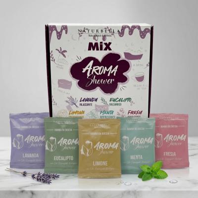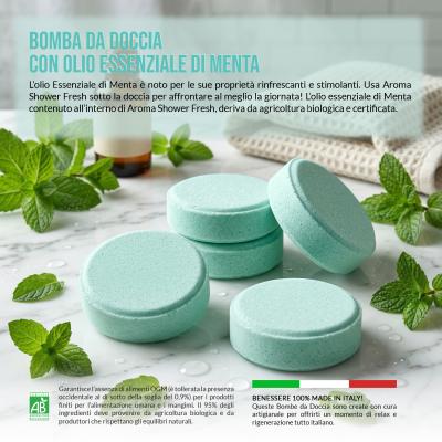 Aroma Shower Menta: Sodium bicarbonate, Citric acid, Parfum, Polysorbate 80, Hydrated silica, Alpha-Terpinene, Beta-Caryophyllnese, Camphor, Carvone, Citral, Citronellol, Citrus limon peel oil, Coumarin, Eugenol, Geraniol, Geranyl Acetate, Hexamethylindanopyran, Limonene, Linalool, *Mentha viris leaf oil, Menthol, Pinene, Terpineol, Terpinolene, CI 77891, CI 47005:1, CI 42090:1.