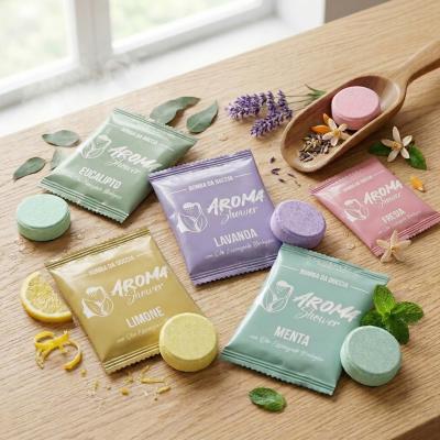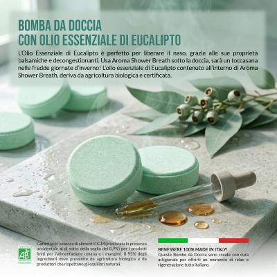 Aroma Shower Eucalipto: Sodium bicarbonate, Citric acid, Parfum, Polysorbate 80, Hydrated silica, *Eucalyptus globulus leaf oil, Menthol, Limonene, Linalool, CI 47005:1, CI 42090:1.