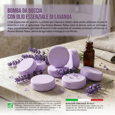 Aroma Shower Lavanda: Sodium bicarbonate, Citric acid, Parfum, Polysorbate 80, Hydrated silica, *Lavandula spica flower oil, Citral, Citronellol, Limonene, Linalool, Coumarin, Geraniol, CI 77891, CI 75470, CI 42090:1.