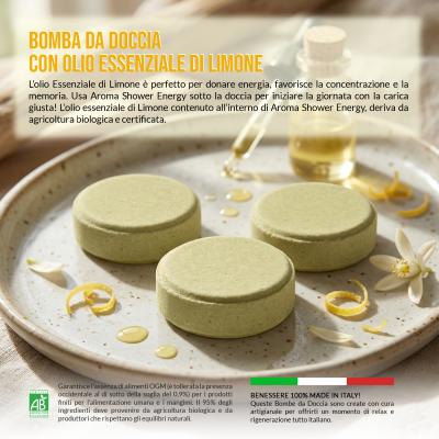 Aroma Shower Limone: Sodium bicarbonate, Citric acid, Parfum, Polysorbate 80, Hydrated silica, Limonene, *Citrus limon peel oil, Citral, Citronellol, Eugenol, Farnesol, Geraniol, Linalool, CI Complessi 2-(1,3-diidro-1,3-diosso-2Hinden-2-iliden)-1,2-diidro-6,7-chinolindisolfonato.