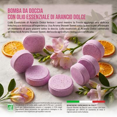 Aroma Shower Fresia: Sodium bicarbonate, Citric acid, Parfum, Polysorbate 80, Hydrated silica, Amyl Cinnamal, Benzyl Alcohol, Benzyl Benzoate, Benzyl Salicylate, Carvone, Citral, Citronellol, Geraniol, Hexamethylindanopyran, Hexyl Cinnamal, Limonene, Linalool, Pinene, Rose Ketones, *Citrus aurantium dulcis (orange) peel oil, CI 77220, CI 14720:1.