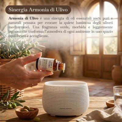 Per esaltare le note mediterranee, puoi aggiungere alcune gocce della sinergia di oli essenziali Armonia di Ulivo direttamente sui trucioli e sulle foglie. Questo permette di intensificare la fragranza e rinnovarla nel tempo, trasformando l’ambiente in uno spazio di quiete e serenità.